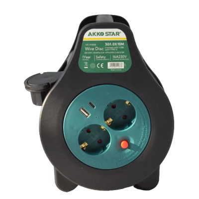 Удлинитель силовой на катушке AKKOSTAR 2- гнезда+USB+TypeC с заземлением 16A-...